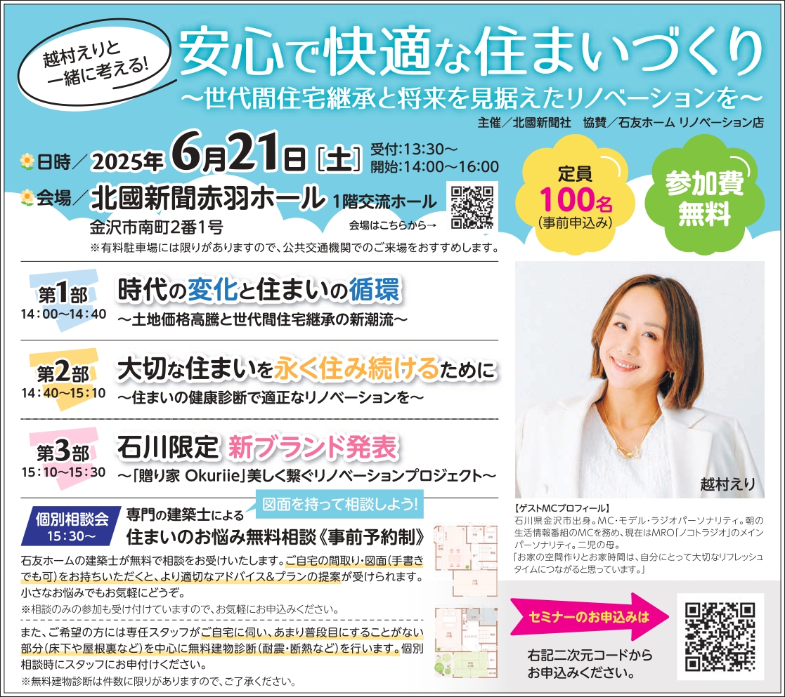 『石友ホーム』では、これからの住まいづくりを検討する人に向けたイベント「安心で快適な住まいづくり~世代間住宅継承と将来を見据えたリノベーションを〜」を6月21日(土)に開催する。本イベントは3部構成。第1部は「時代の変化と住まいの循環」と題して、土地の価格高騰の今、世代間住宅継承について考える。第2部は「大切な住まいを永く住み続けるために」をテーマに、住まいの健康診断で適正なリノベーションを促していく。第3部の「石川限定新ブランド発表」では、「贈り家 Okuriie」という美しく繋ぐリノベーションプロジェクトを発表する。専門の建築士による住まいの悩み無料相談も実施。自宅の間取りや図面を持参するとより適切なアドバイスが受けられる。事前予約制となっているので、今後の暮らし方を考えたい人はぜひ足を運んでみよう。