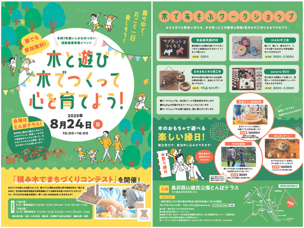 「夏休みの自由工作、どうしよう…」と、毎年頭を抱えるお子さん、親御さんにおすすめの体験型木育イベント「木と遊び、木で作って、心を育てよう!」 が、金沢市『奥卯辰山健民公園とんぼテラス』にて、8月24日(日)に開催される。子どもでも簡単に作れる木を使った工作教室のほか、木のおもちゃで遊べる縁日など、森の中で1日中楽しめる内容だ。