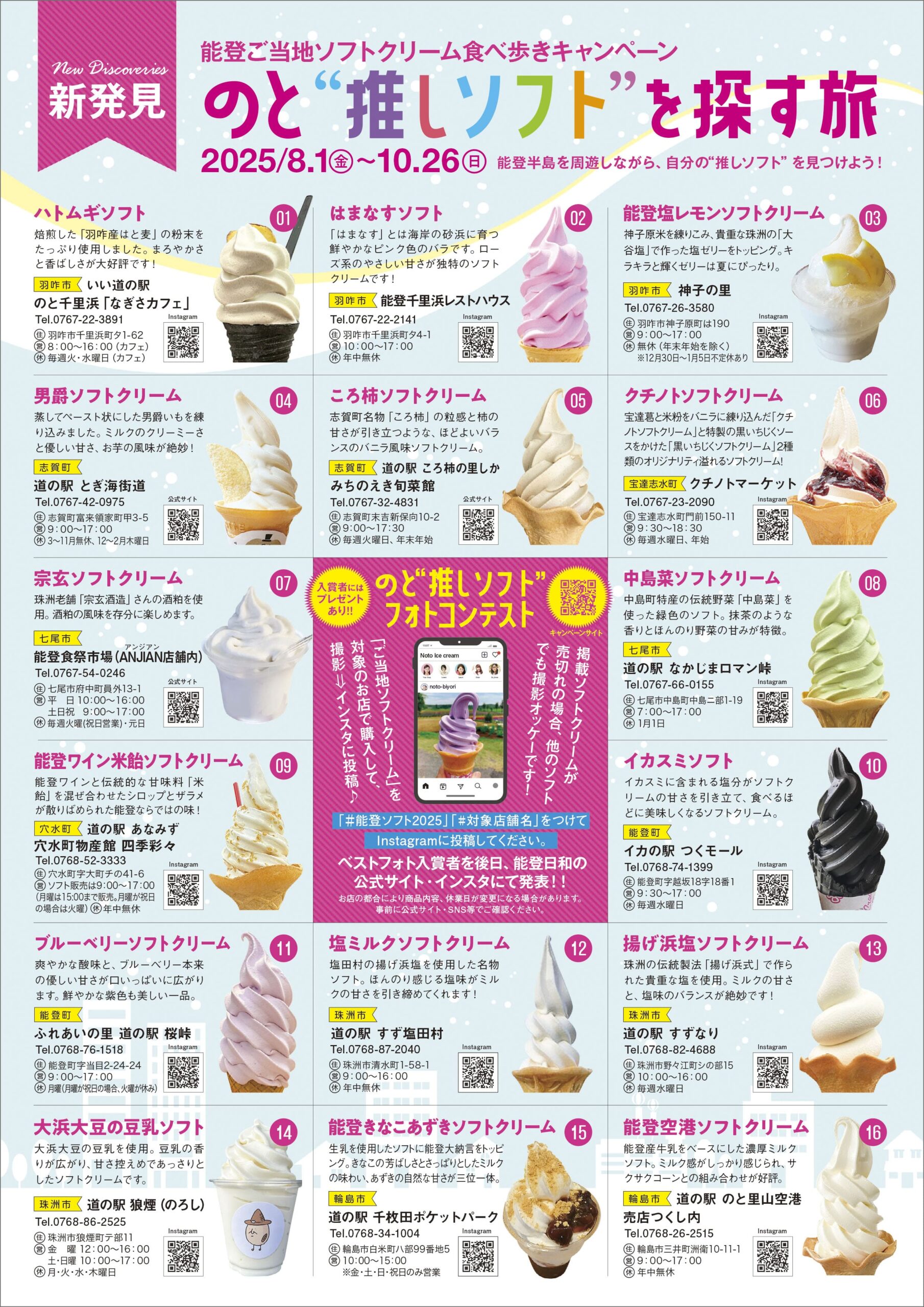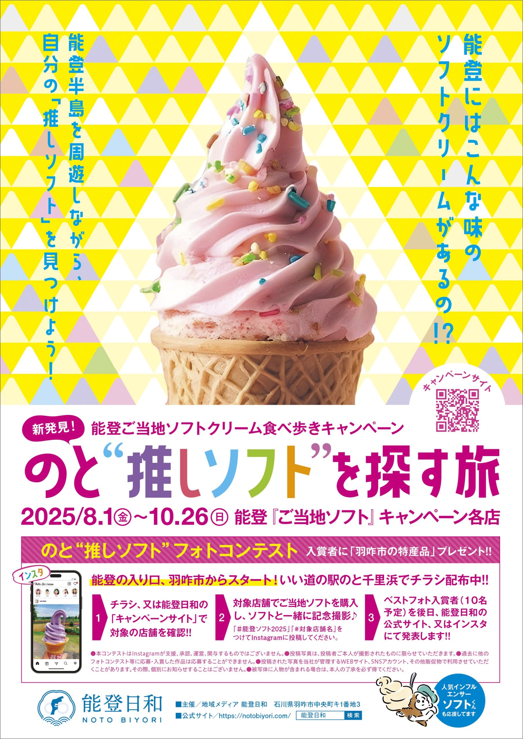 同キャンペーンの特別アンバサダーには、人気インフルエンサー「ソフトくん」が就任。約4年間にわたって県内各地を巡り、PRなし・完全実費でソフトクリームを食べ続けてきたソフトくんは、県内のソフトクリームはほぼ食べ尽くしたそう。そんなソフトくんおすすめの”推しソフト”が能登にはたくさんある。フォトコンテストも同時開催されるので、能登旅の思い出作りにもぴったりだ。入賞者10名には羽咋市特産品のプレゼントもある。能登の玄関口羽咋市をスタートし、奥能登までの「ソフトクリームまっぷ」を持って、お気に入りのフレーバーを探しにいってみてはいかがだろう。