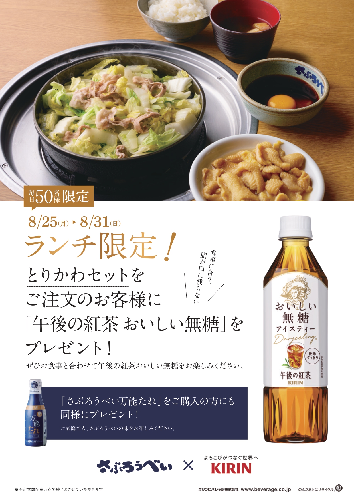紅茶はスイーツに合わせることが一般的だと思われがちだが、「キリン 午後の紅茶 おいしい無糖」は食事、特に油を使った料理との相性が抜群であることをご存知だろうか。そんな”後味すっきり感”を体験できるスペシャルコラボキャンペーンが、【8月25日(月)〜31日(日)】の7日間、『さぶろうべい』の【直営4店舗+FC富山小杉店】で開催される。ランチタイム限定で、同店の看板メニュー「白菜鍋+とりかわセット」を注文、または「万能たれ」を購入の方に「キリン 午後の紅茶 おいしい無糖 500mlペットボトル」を1本プレゼント。1日50名限定の特別企画だ。
