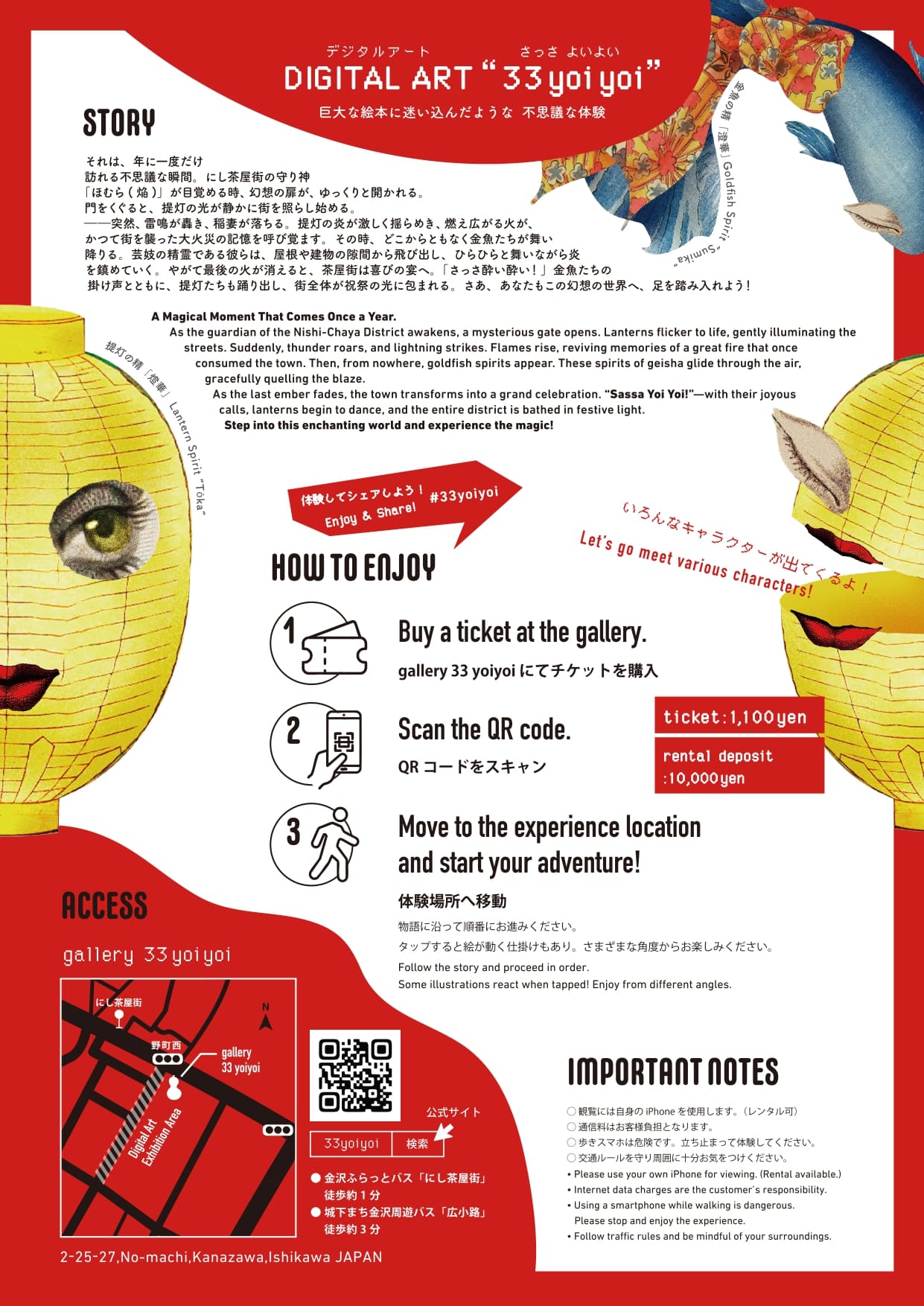 チケットを購入して、スマートフォンでQRコードを読み込むと物語がスタート。体験場所は、にし茶屋街のメインストリート。指定場所に行くと自動的に作品が動き出し日常とデジタルの融合を体験できる。にし茶屋通り全体を使った作品はひとつの物語になっており、まるで巨大な絵本の中に迷い込んだような、不思議な時間が待っている。
