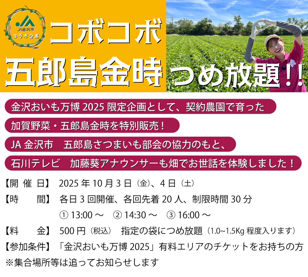 10月3日(金)と4日(土)には、JA金沢市五郎島さつまいも部会の協力を得て育てた加賀野菜「五郎島金時」のお得な詰め放題イベントを開催。各日3回、先着20名、制限時間30分。こちらの限定企画で販売するさつまいもは、石川テレビの加藤葵アナウンサーがお世話をする様子を「石川さんパレット」で随時放送中だ。実りの秋に足を運びたくなる、この時期ならではのイベント。入場時間などの詳細は下記をチェックしよう。