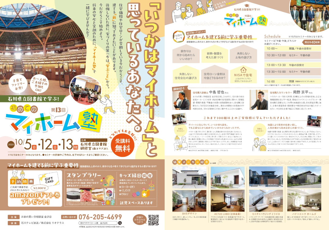 住宅価格が高騰する今こそ、賢く、楽しく学びたい。マイホームを考えているすべての人に向けて、建てる「前」に知っておきたい大切なことを学べる「はじめてのマイホーム塾」。毎回好評のイベントが、10月12日(日)・13日(月・祝)に石川県立図書館にて開催される。これまでに300組以上が参加し、「資金の見通しが立てやすくなった」「不安がワクワクに変わった」といった声が寄せられる人気イベントだ。
