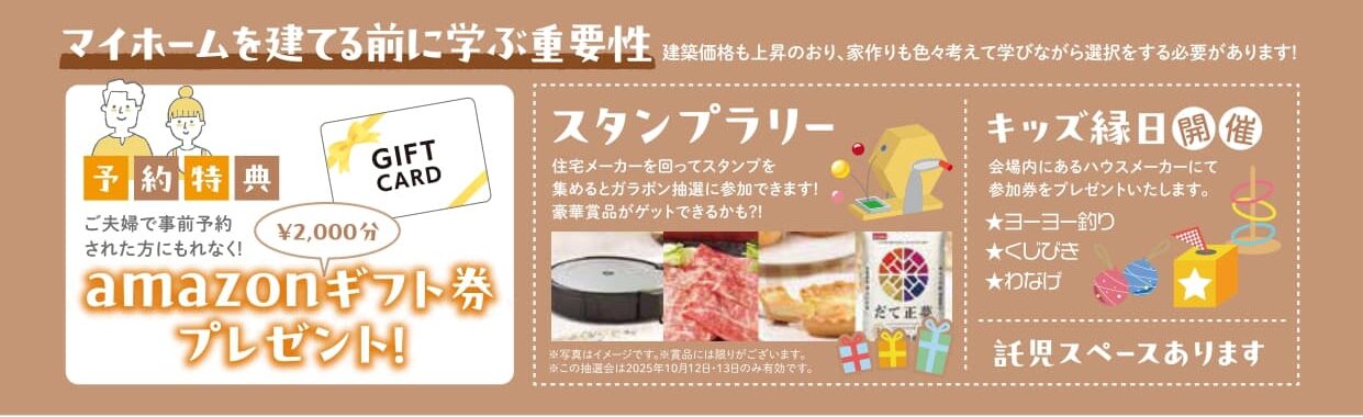さらに会場では子どもも楽しめる企画もいっぱい!ヨーヨー釣りや輪投げ、くじ引きなどで盛り上がる「キッズ縁日」、親子で挑戦できる「スタンプラリー」もすべて無料。会場には託児スペースも用意されており、安心してセミナーに集中できるのも嬉しいポイントだ。夫婦で事前予約するとAmazonギフト券2,000円をプレゼント。学んで、遊んで、未来のマイホームをしっかり考える特別な3日間。この機会を見逃さず、一歩を踏み出そう。