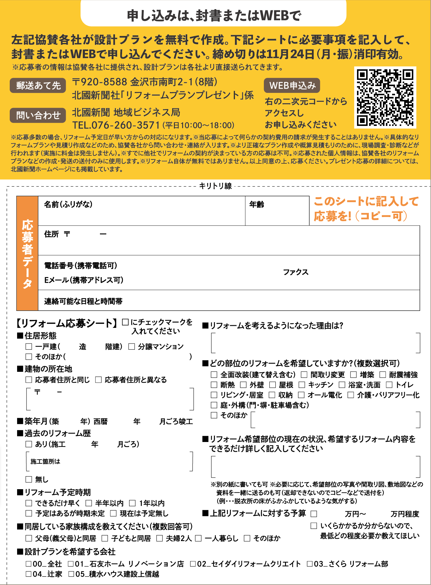 - 協賛各社が設計プランを無料で作成。下記シートに必要事項を記入して、封書またはWEBで申し込んでください。締め切りは11月24日(月・振)消印有効。※応募者の情報は協賛各社に提供され、設計プランは各社より直接送られてきます。