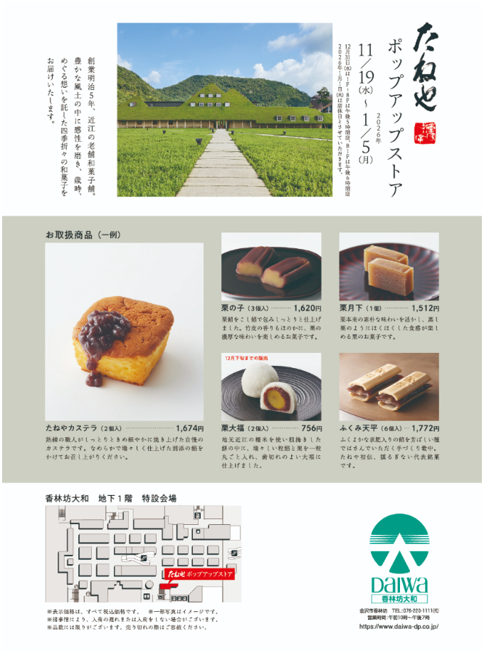 【11/19(水)~1/5(月)】『たねや ポップアップストア』が香林坊大和に期間限定オープン。