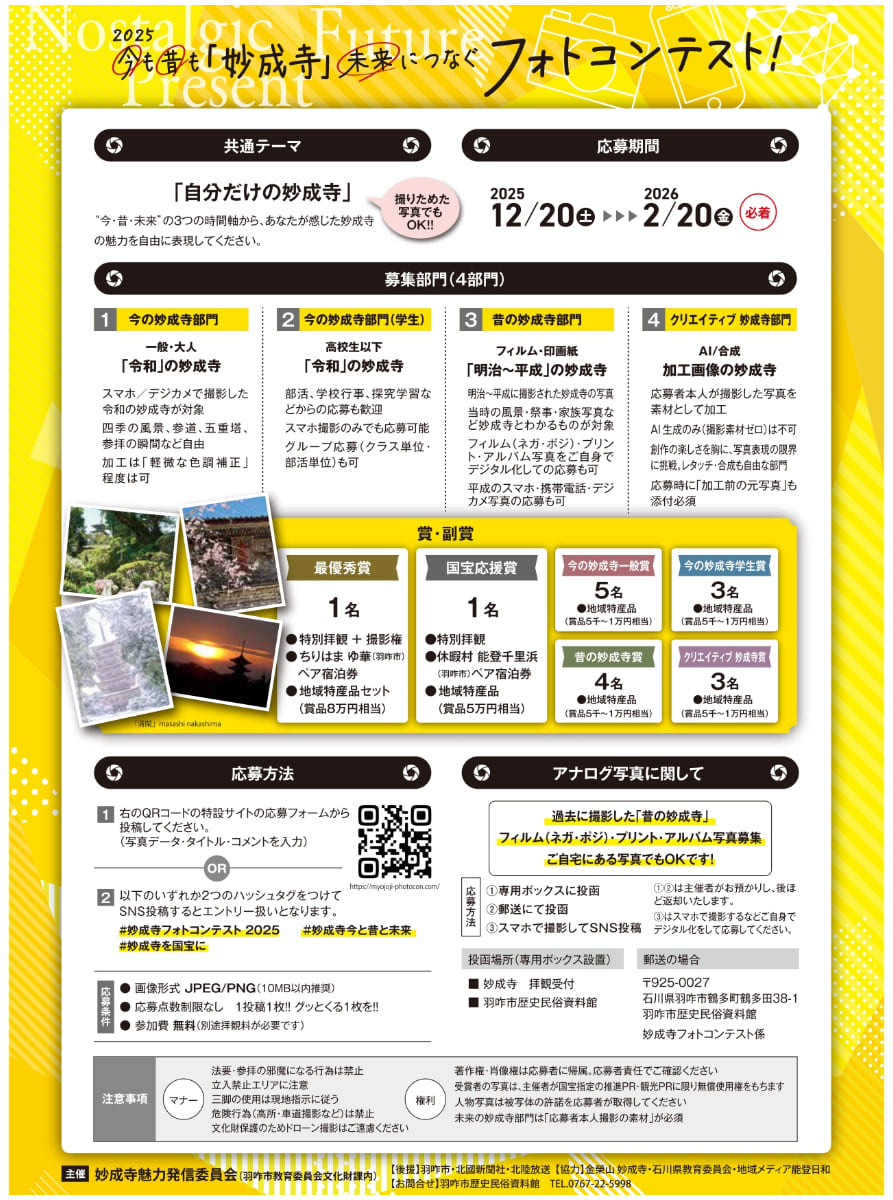 豪華賞品あり! 今・昔・未来の3つの時間軸から「自分だけの妙成寺」の魅力を自由に表現しよう。