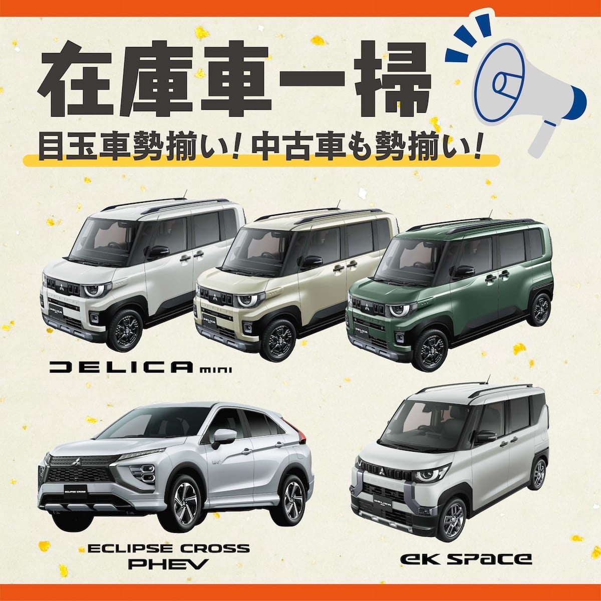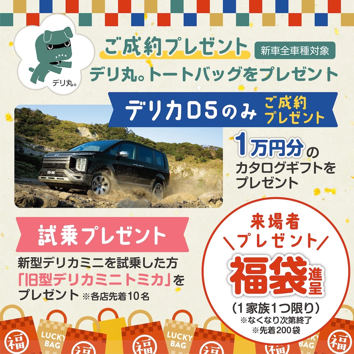 「エクリプスクロス(ガソリン車/PHEV)」「新型デリカミニ」「旧型デリカミニ(2WDのみ)」がお得な価格で勢揃いするほか、新車を成約された方全員にデリ丸トートバッグ、デリカD5をご成約の方には1万円分のカタログギフトがプレゼントされる。また、新型デリカミニを試乗した方(各店先着10名)には「旧型デリカミニトミカ」がプレゼントされる。