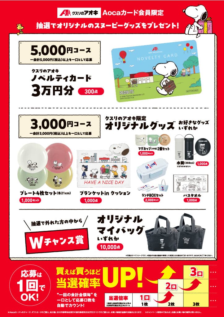 クスリのアオキ40周年を記念して、スヌーピーとコラボした大感謝キャンペーンを開催中。会計時にAocaカードを提示し、1会計あたり税込5,000円以上(5,000円コース)または税込3,000円以上(3,000円コース)を1口として、オリジナルのスヌーピーグッズの抽選に応募できる。