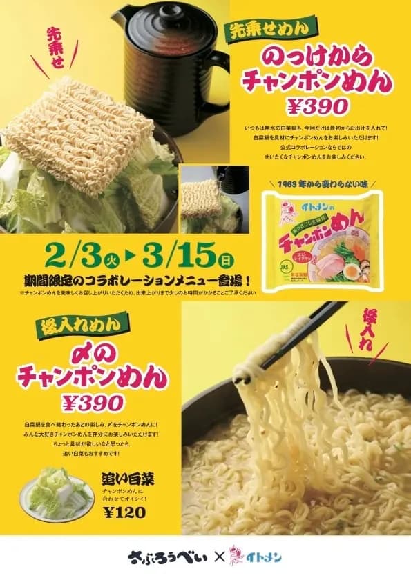 過去に異業種コラボで話題を呼んだ『さぶろうべい』が、黄色い袋麺でおなじみ『イトメン』の「チャンポンめん」とタッグ。2026年2月3日(火)〜3月15日(日)の期間限定で、コラボメニューの提供を行う。