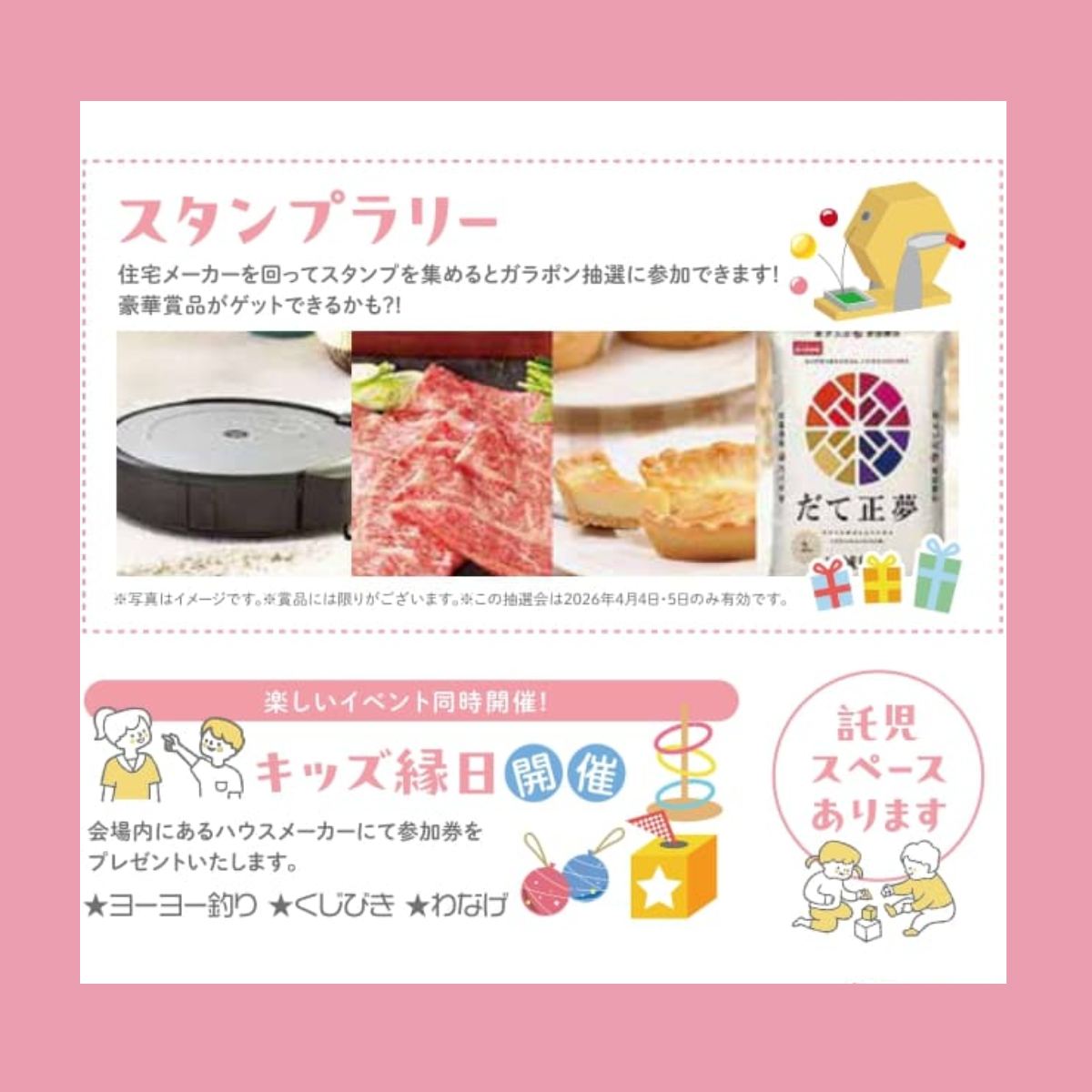 会場内では、協賛ハウスメーカーを巡るスタンプラリーや、家づくりの実例パネル展示、子どもが楽しめるキッズ縁日も同時開催。学ぶだけでなく、ちょっとしたイベント気分で楽しめるのも今回の魅力だ。参加費は無料で、各回先着40組。事前予約のうえ夫婦で参加すると、Amazonギフト券3,000円分の特典も用意されている。