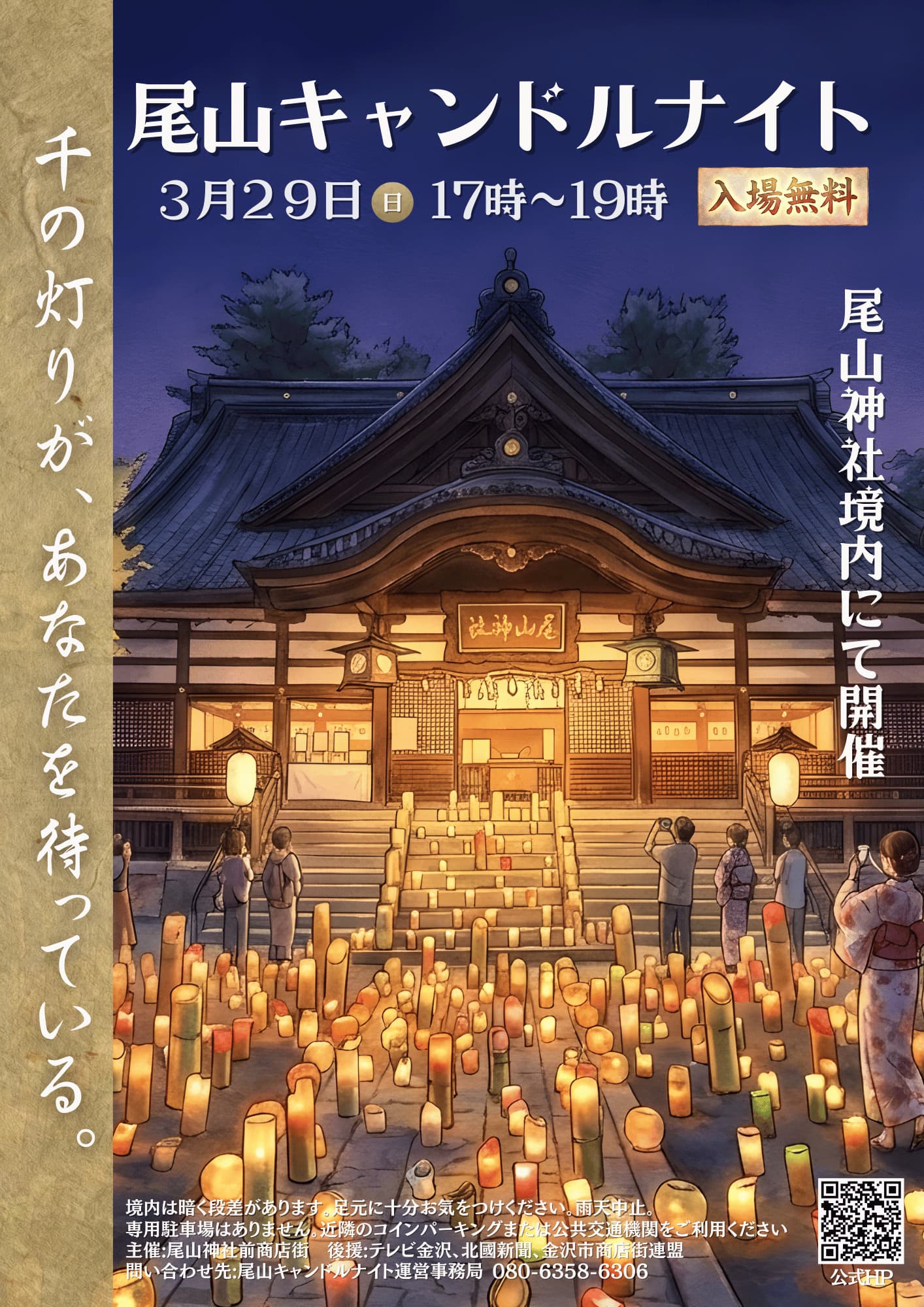 また同日夕方からは、尾山神社境内で「尾山キャンドルナイト」を開催。大中小あわせて約1,000個のキャンドルが灯り、境内は幻想的な空間に包まれる。会場では和太鼓や笛、朗読などのステージ(無料観覧)も予定されており、昼間のにぎわいとはまた違った落ち着いた時間を楽しめる。昼は商店街のにぎわいを、夜は尾山神社の幻想的な灯りを。尾山エリアをゆっくり巡りながら、一日を通して楽しんでみてほしい。