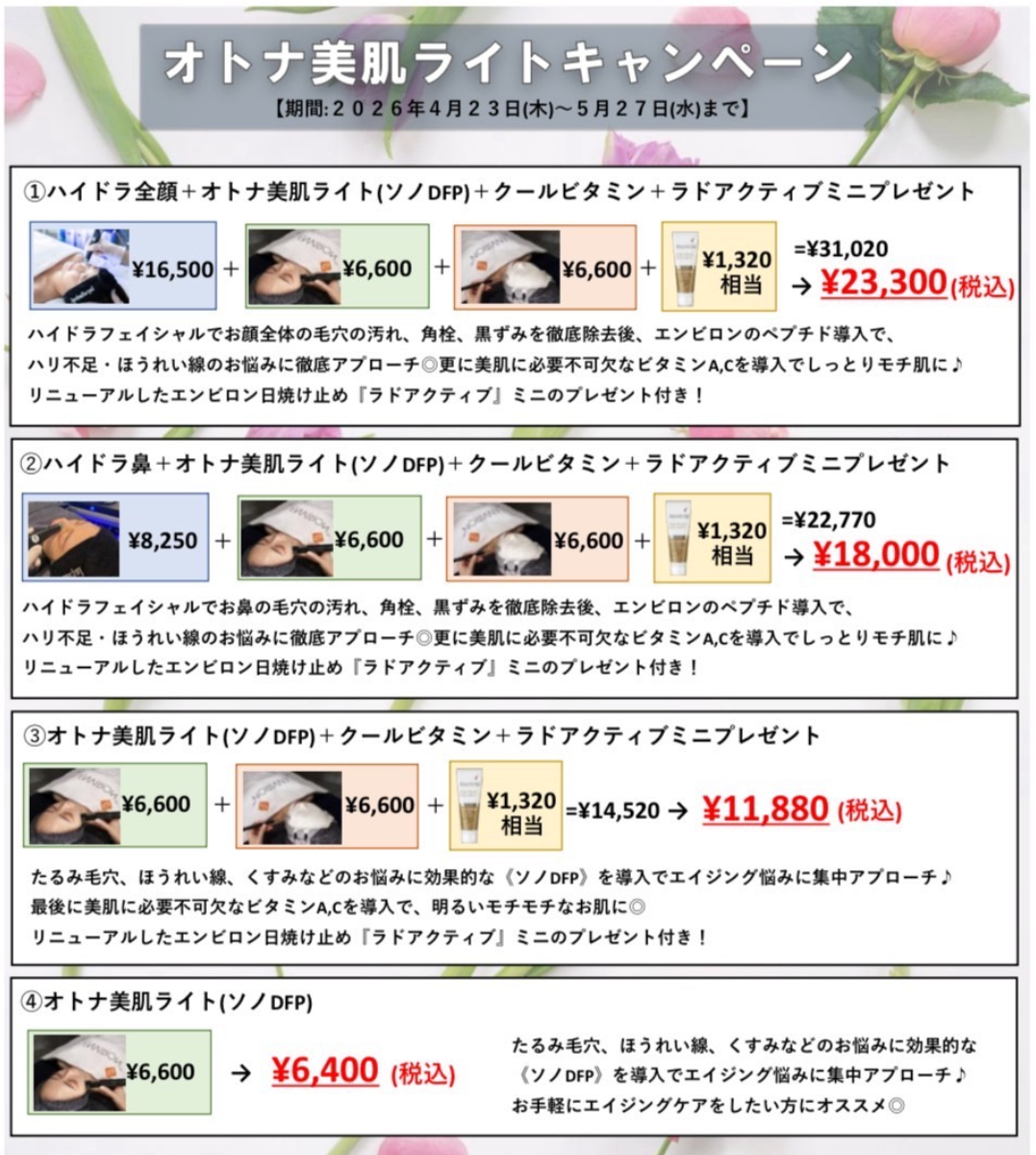 ハイドラ全顔(16,500円)+オトナ美肌ライト(ソノDFP)(6,600円)+クールビタミン(6,600円)+ラドアクティブミニプレゼント(1,320円相当)