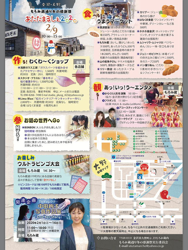 個性的な店舗が集まる金沢市大野町のもろみ蔵通りで、寒い冬に心と体をほっこりさせる冬の感謝祭「あたたまるしぇ2020」が開催。ほっかほっかの肉まん、めった汁、うどん等、地元の大野醤油を使ったあつあつメニューをはじめ、いろいろなワークショップや、からくり人形、フラダンスなど、さまざまな企画が予定されている。大野町を拠点とする作家の手づくり作品などの素敵な景品が当たるウルトラビンゴ大会も。