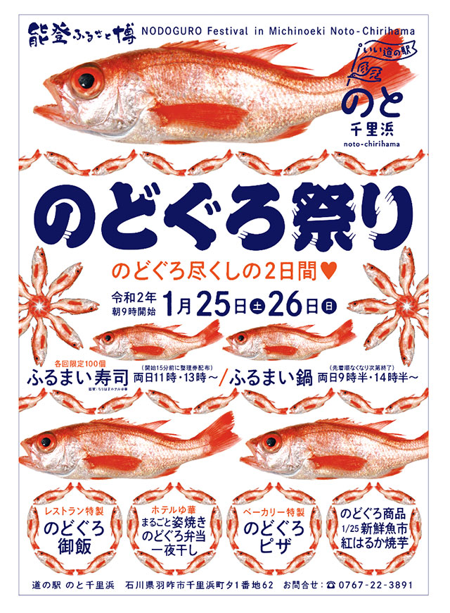 毎年人気の「のどぐろ祭り」が今年も『道の駅のと千里浜』で開催。各回限定100個「のどぐろ寿司」のふるまい、先着順「のどぐろ鍋」のふるまいは行列ができる評判ぶり。『ちりはまホテルゆ華』の「のどぐろ弁当」「まるごと姿焼き」「一夜干し」、イベント限定レストランのとののど手製「のどぐろご飯」、ベーカリー特製「のどぐろピザ」など、のどぐろ尽くしを味わおう。