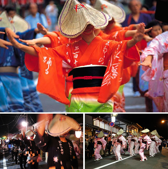 毎年全国から観客が訪れる由緒ある民謡行事。踊り手は揃いの浴衣を着用し、おわら節に合わせて踊りながら町内を練り歩く。編笠から少しだけ顔を覗かせる優美な姿は来訪者を魅了する。風情漂う八尾の町並みで演舞する艶やかな「女踊り」、勇壮な「男踊り」、楽器の音色が幻想的な世界へと誘うだろう。町流しは各町内11ヶ所で。保存会各支部による演舞会は八尾小学校グラウンドにて行われる。