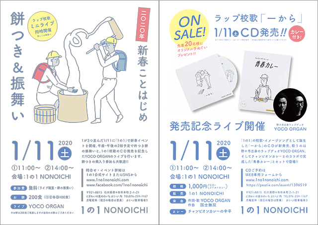 《また一からいつでもはじめる》、《一から 一から また新しい今日がはじまる》といった歌詞は、ラップのリズムと合わせて、耳に残りやすい内容に仕上がった。早くも野々市市のテレビCMで流れているので耳にした人はいるはず。その「CD付き青春カレー」発売を記念したミニライブが『1の1 NONOICHI』で行われる。ライブは1日に2回予定されており、その中で餅つき&振る舞いも行われるので新春のイベントとしても盛り上がるだろう。YOCO ORGANの公式サイト上に校歌について語られた映像が公開されているのでそちらも要チェックだ。