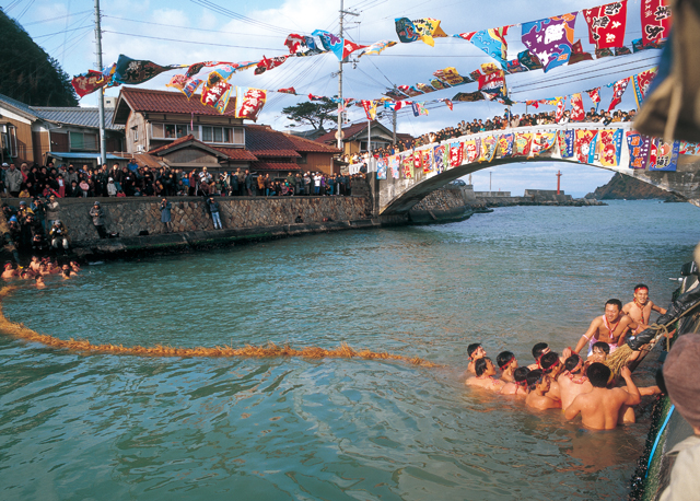 地元の青年たちが川の中で東西に分かれて綱を引く伝統行事「水中綱引き」が、1月第3日曜日に福井県美浜町日向で開催される。その昔、災害の土砂を取り除く際に大蛇が現れ作業を妨げようとしたのを、長い綱を張って防いだと言い伝えたことが由来。綱は引きちぎるように引き合い、どちらか一方が切れると、綱を海の神にささげるために海へ流される。国選択無形民俗文化財。