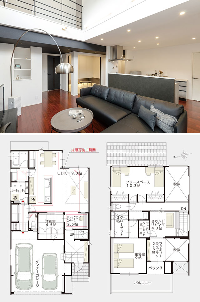 上/オープンキッチンを中心とした、床暖房付きの吹き抜けLDK。水回りやガレージへのアクセスもスムーズ。下/家事動線の計算された間取り。長期優良住宅、高水準制震装置が標準仕様。