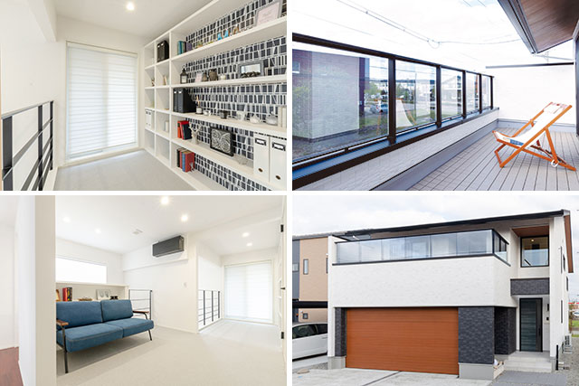 上左・下左/2Fのセカンドリビング(下)とそこからつながるファミリーライブラリー(上)。居心地よく、訪れるゲストに人気のスペースとなっている。上右/大型バルコニーは見た目のインパクトはもちろん、ガーデニングなど趣味スペースにも使いやすい。下右/落ち着いたモノトーンスタイルの外観デザイン。
