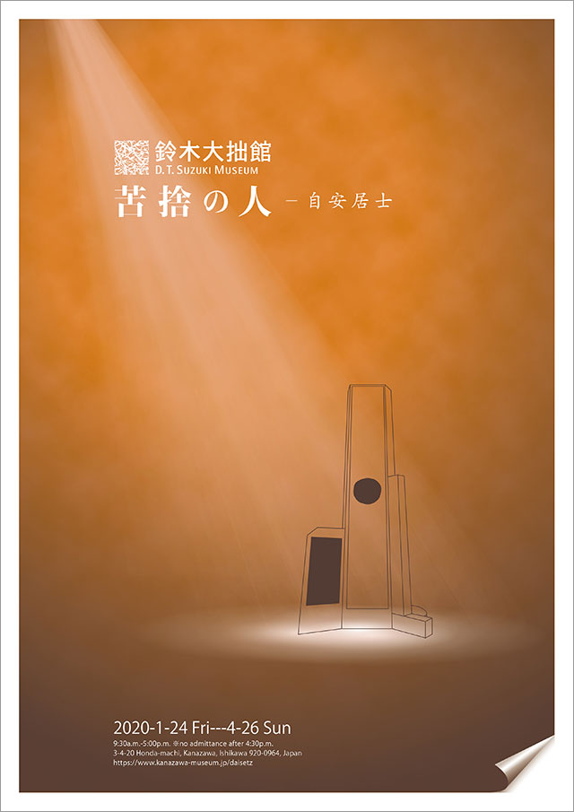 鈴木大拙の同郷の実業家・安宅彌吉(あたか やきち・居士号「自安(じあん)」)と大拙のつながりに注目した企画展。彌吉は、計り知れないほど惜しみなく、若き貞太郎時代から大拙の仕事を援助した。英文著作の刊行費等を多く負担した彌吉は、大拙を世界的な仏教哲学者D.T.Suzukiへとならしめた人物といえるだろう。喜捨(きしゃ)は自らの意志で進んで寄付をすることだが、財に恵まれても出せるものではない。大拙は彌吉のことを「喜捨」ではなく「苦捨」をして支え続けてくれたと語っている。鎌倉の東慶寺の墓地で横並びに寄り添うように眠る彌吉と大拙。たんなる経済的な支援者と被支援者の関係を越えた二人のつながりから見えるものは何か。鈴木大拙館で見つけよう。
