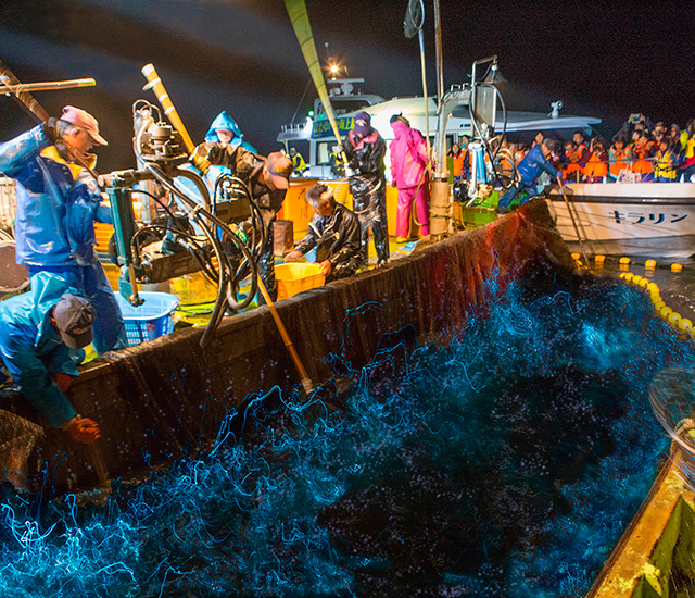 富山湾の神秘、ホタルイカ。1年間でもわずか数か月だけという定置網でのホタルイカ漁を、観光船から見学するツアーが4月から5月上旬まで行われる。期間中は、早朝に滑川漁港を出航。夜明け前の海上で、青白い光を放つ幻想的なホタルイカの群れを間近に見るために早起きをして出発する。土日祝日は予約が埋まりやすいので早めの予約がおすすめ。詳細は公式サイトの確認を。