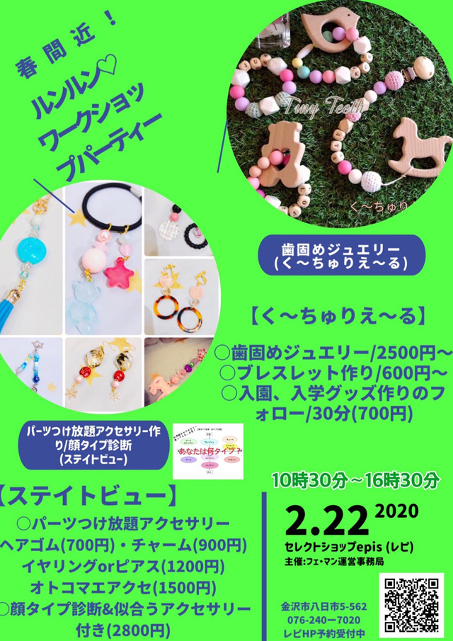 毎日の生活がちょっと楽しくなるような、こだわりの生活雑貨を揃えるセレクトショップ『epis』にて「春間近! ルンルン♡ワークショップパーティー」を開催。当日は、好きなパーツを組み合わせて作るアクセサリー作りのほか、歯固めジュエリー、ブレスレット作り、自分の似合うアクセサリー顔タイプ診断などが体験できるほか、入園、入学グッズ作りの相談・フォローといったものも。大人から子どもまで楽しめるイベントだ。