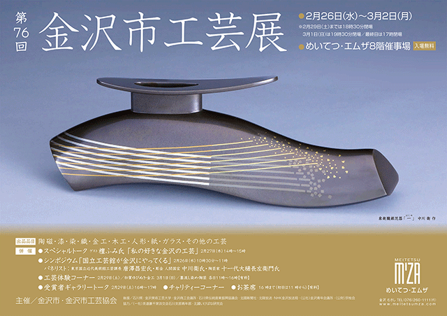 3月2日(月)まで、めいてつ・エムザ8階催事場にて、金沢市工芸協会会員および一般公募の中から選ばれた入賞・入選作品約200点が展示される。上記写真(ポスター)の美しい作品は、人間国宝の中川衛さんの象嵌の技法でつくられた花器。そのほか、陶磁・漆・染・織・金工・木工・人形・紙・ガラスなどの工芸作品が並ぶ。毎年好評のチャリティーコーナーも開催。