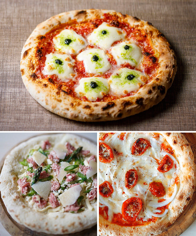上/ダブルチーズマルゲリータ 下左/能登豚サルシッチャと春アスパラ 下右/極甘ドライトマトと新たまねぎ