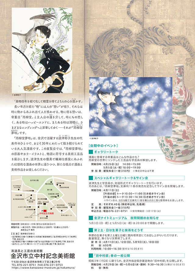泉鏡花作品の漫画化など幻想的な作風で知られ、金沢で活躍する波津彬子(はつあきこ)さんが30年にわたって描き続ける人気漫画『雨柳堂夢咄(うりゅうどうゆめばなし)』。古美術商を営む青年のもとに集まる、いわくのある古美術品について、長い年月を経た美術品がもつ美しくも物悲しい物語を解き明かしていくストーリーが秀逸。