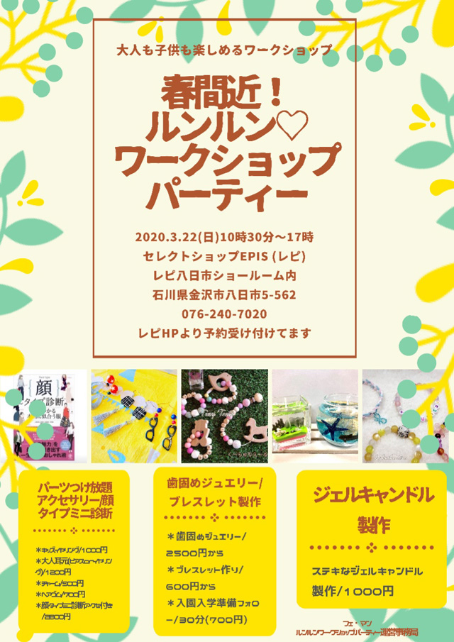 毎日の生活がちょっと楽しくなるような、こだわりの生活雑貨を揃えるセレクトショップ『epis』にて「春近々! ルンルン♡ワークショップパーティー」を開催。当日は、好きなパーツを組み合わせて作るアクセサリー作りや、歯固めジュエリー、ジェルキャンドル作り、自分の似合うアクセサリー顔タイプ診断などが体験できるほか、来場者にはささやかなプレゼントの用意も。大人から子どもまで楽しめるイベントだ。