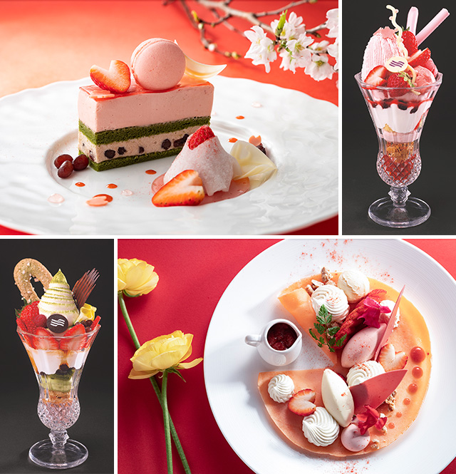 上左/[3月のスイーツプレートセット]桜と小豆のムース 春苺とともに 上右/[3月のマンスリーパフェ]桜のモンブランパフェ 下左/[4月のマンスリーパフェ]抹茶のティラミスパフェ 下右/[4月のスイーツプレートセット]春の苺プレート クレープ仕立て