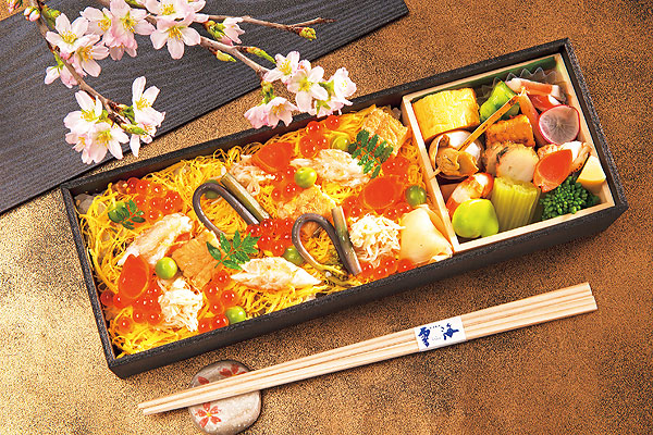 毛蟹や山菜、春の野菜を用いた行楽におすすめの調理長自慢のお弁当。