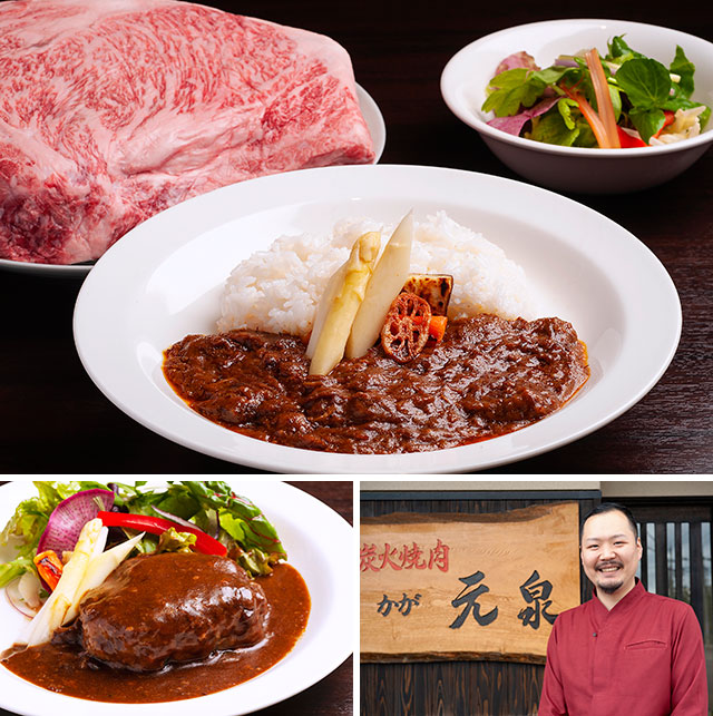 上/和牛をふんだんに溶かし込んだ贅沢な「特製和牛カレー」2,500円(税込)。サラダとスープ付き。 下左/「特製和牛ハンバーグ」200g 2,500円(税込)。スープとライス付き。下右/修業時代に磨いた技と感性を遺憾なく発揮する齋容さん。