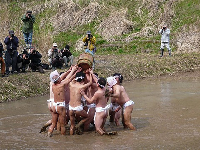 毎年4月2日に行う能登町藤波地区の神事。1斗入りの酒樽に酒を入れて供え、祝詞を奏上。その後は10名余の若者達が、ふんどし1つの裸となって酒樽をかつぎだし、田んぼや海の中で奪い合うところが見どころだ。また、樽の中でもまれたお酒の味は格別だといわれている。今年は、新型コロナウイルス感染症が拡大している状況を受け、酒樽の奪い合いは中止。神事のみの実施となる。