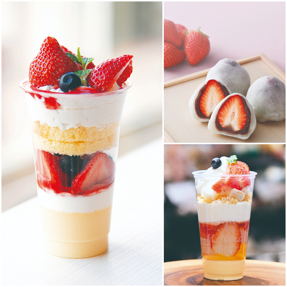 ■左『フルーツむらはた』日替わりブランド苺パフェ※12日(火)まで ■右上『和菓子村上』+『フルーツむらはた』いちご大福(あまおう)※12日(火)まで ■右下『堀他』お持ち帰りパフェ