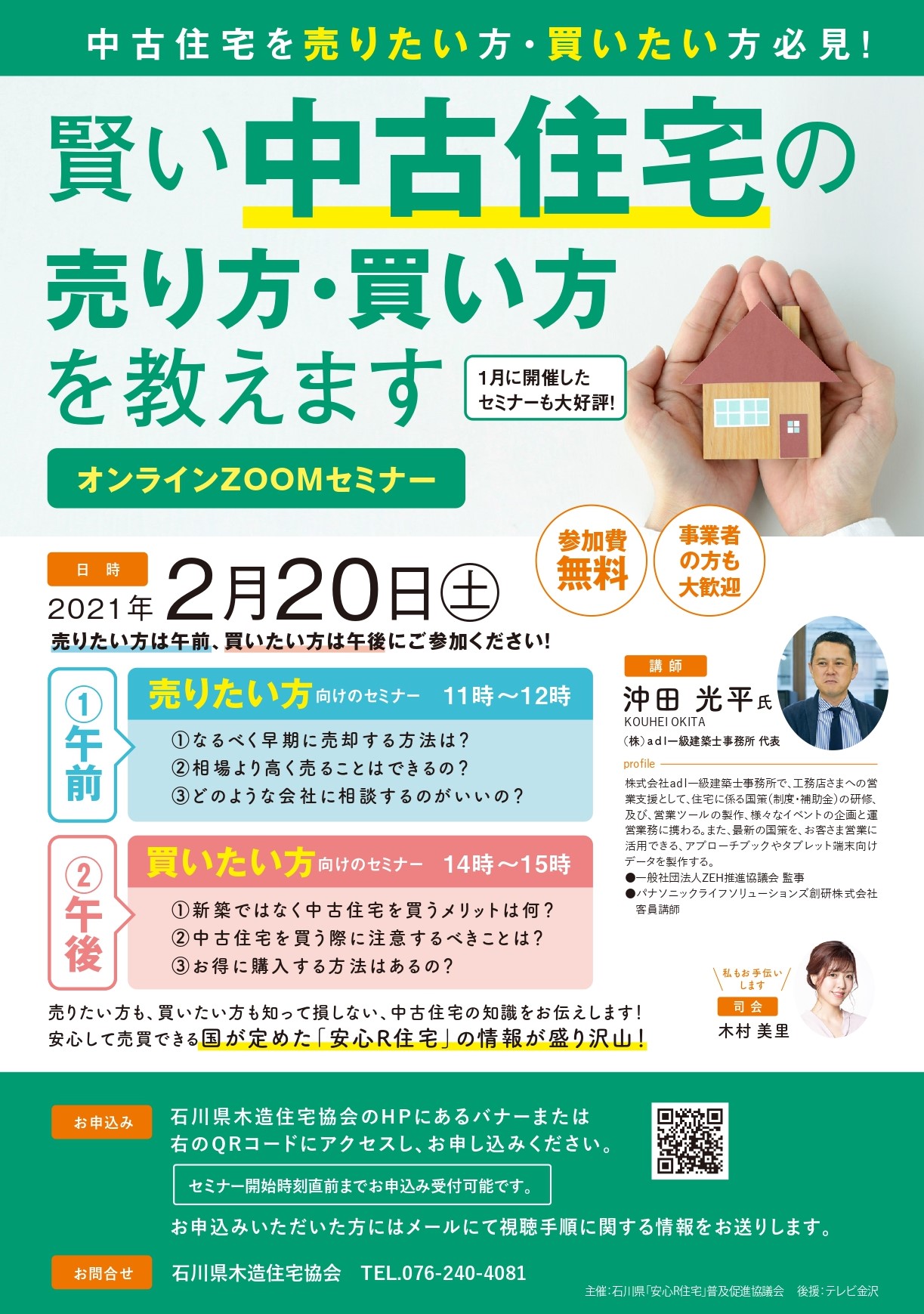 リノベーションによる性能向上や近年のDIYブーム等もあり、若い世代でも中古住宅を選ぶ人が増えているという。しかし、知識不足で不良物件を買ってしまったと後悔するのは避けたいもの。そんな時は、経験豊富なプロの話を聞くのがおすすめだ。今年1月に開催された「中古住宅の見極め方セミナー」は、オンラインという気軽さもあって多くの人が参加。もっと話を聞きたいとの要望もあり、買い方だけではなく、売り方のコツも加えて2月に開催する運びとなった。講師は前回に引き続き、「株式会社 adI一級建築士事務所」代表の沖田光平氏。「相場より高く売ることはできるの?」、「「中古住宅を買う際に注意すべきことは?」といった疑問を中心に、数多くの中古物件を見てきたプロの視点で分かりやすく教えてくれる。参加費は無料、事業者の人でも参加可能なので、気軽にのぞいてみてはいかが。