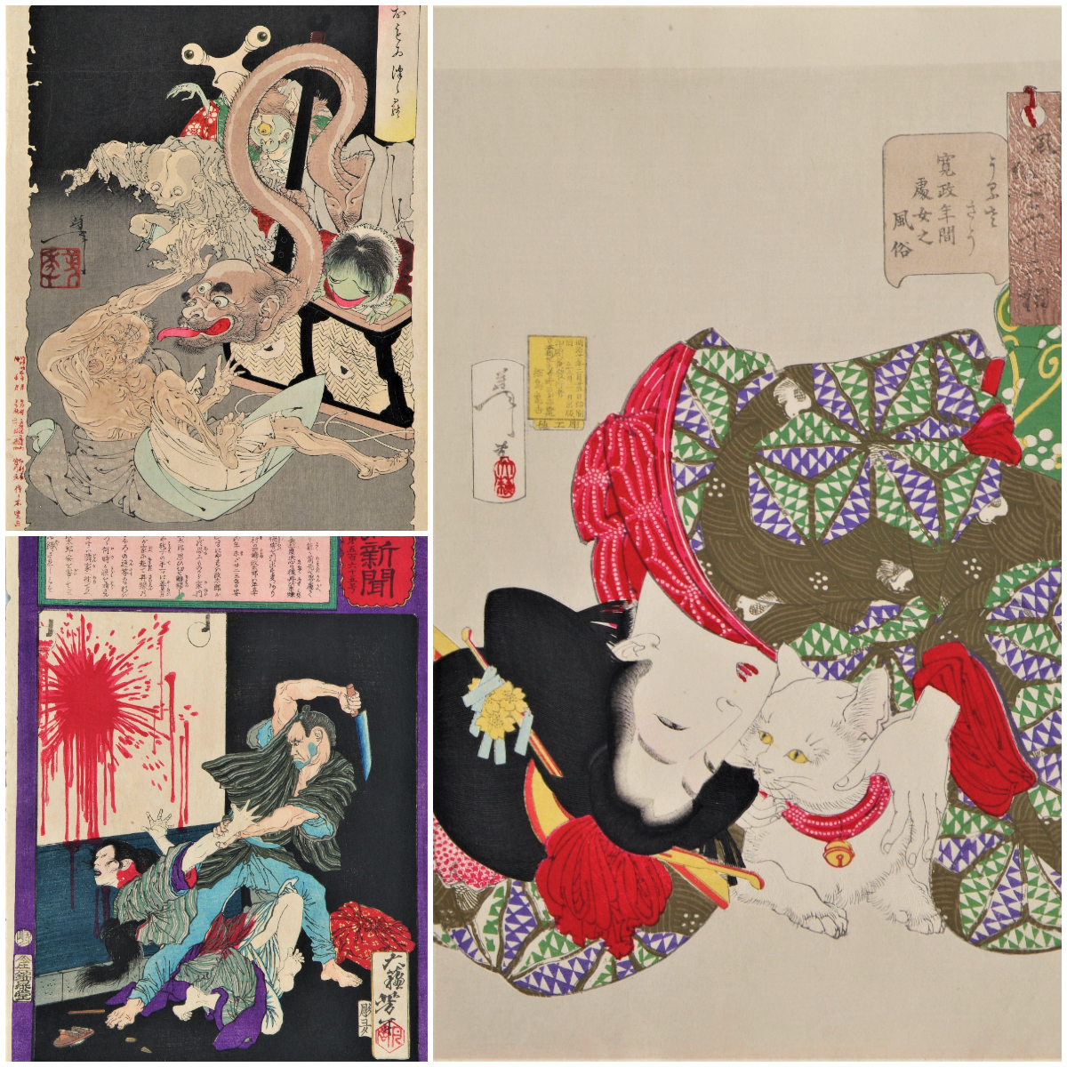 左上/「新形二十六怪撰 おもゐつ〻ら」明治25(1892)年、左下/「郵便報知新聞 第五百六十五号」明治8(1875)年、右/「風俗三十二相 うるささう 寛政年間処女之風俗」明治21(1888)年 ※以上、部分
