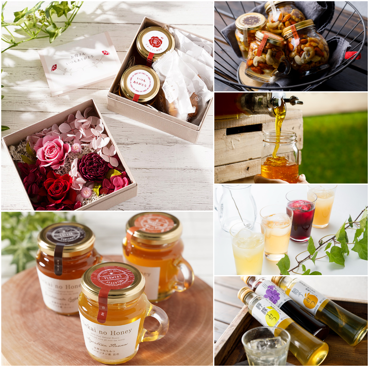 「完熟・生」純粋はちみつ専門店希少な生はちみつとお花の重ね箱やハニードリンクなど、母の日ギフトに最適なアイテムが充実。