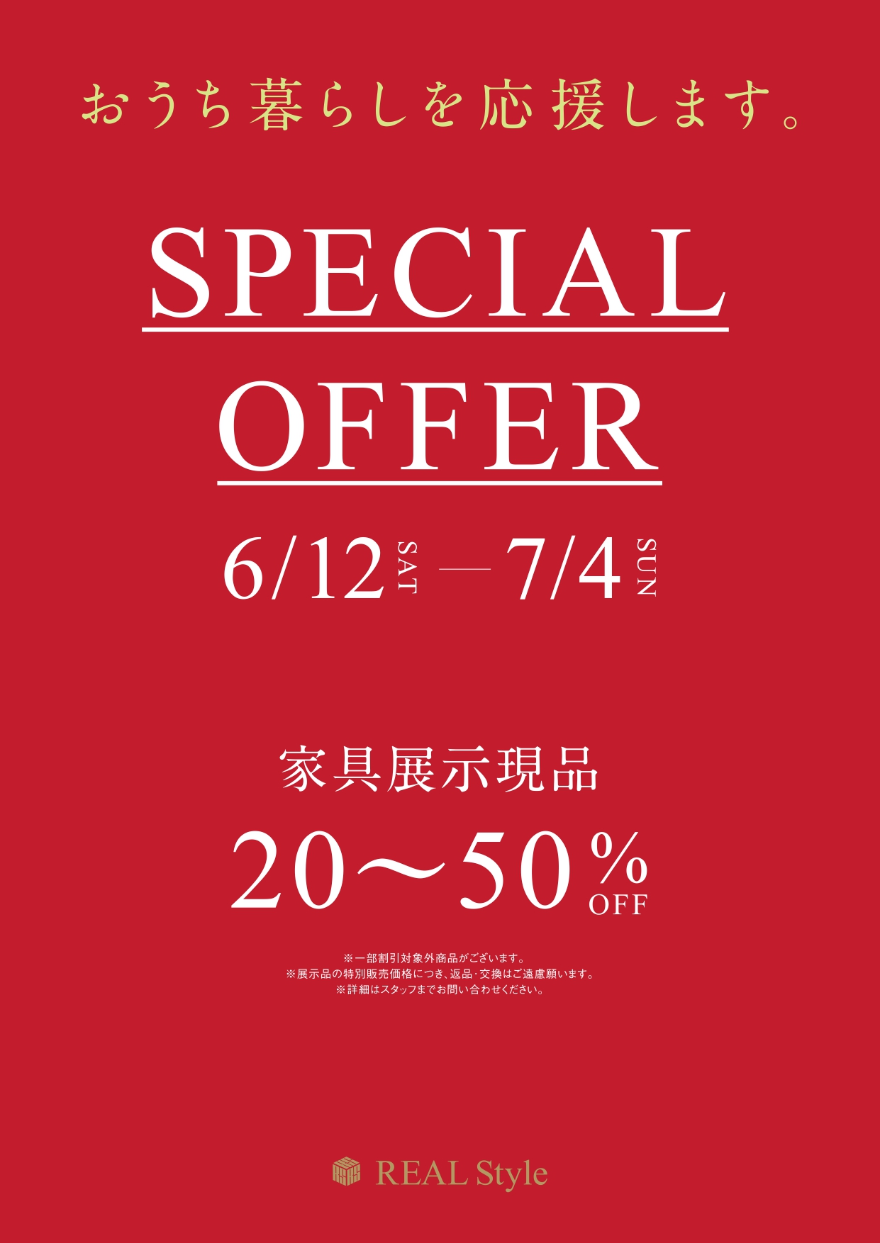 「豊かな暮らし」をコンセプトに小物から家具、ファブリック、グリーンに至るまでトータルに暮らし方を提案するライフスタイルショップ『リアルスタイル金沢』。2021年6月12日から7月4日の期間限定で「SPECIAL OFFER(スペシャルオファー)」を開催。「おうち暮らしを応援!」をテーマに、家具展示現品がなんと20~50%OFFに。