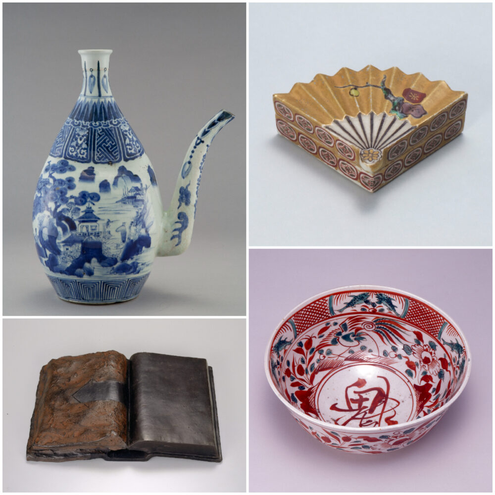 左上/「若杉窯 染付楼閣山水文大水注」(小松市立博物館所蔵)、左下/八木一夫「黒のメッセージ」(東京国立近代美術館所蔵)、右上/青木木米「扇形梅の絵香合」(金沢市立中村記念美術館所蔵)金沢市指定文化財、右下/「春日山窯 呉須赤絵写魁花鳥図鉢」(金沢卯辰山工芸工房所蔵)