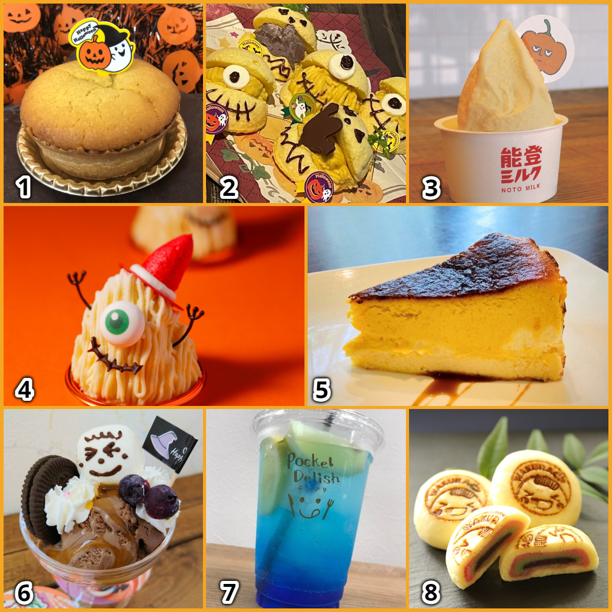 1/Hallo PA(かぼちゃパイタルト) 、2/かぼちゃシフォンのハロウィントッツオ、3/能登かぼちゃ(ジェラート)、4/ナイトメア(モンブラン)、5/かぼちゃのバスクチーズケーキ、6/ハロウィーンブルーベリーパフェ、7/flavorレモネード、8/わくたまんじゅう