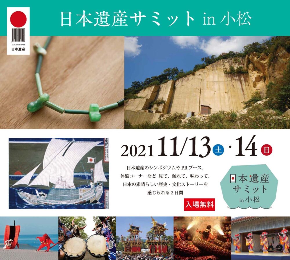 文化庁では、地域の歴史的な魅力や特色を通じて、日本の文化・伝統を語るストーリーを「日本遺産(Japan Heritage)」として認定。 それらのストーリーを語る上で不可欠な、魅力ある有形・無形の文化財群を総合的に活用する取り組みを支援している。また、毎年認定を受けた全国の日本遺産認定協議会が集結して日本遺産サミットを開催。今年は石川県小松市が会場として選ばれ、小松駅周辺のメイン会場や、小松市の日本遺産「石の文化」と「北前船」のゆかりの地である石切り場や安宅などのサテライト会場、さらに市内各所の文化施設にて様々な催しが開催される。