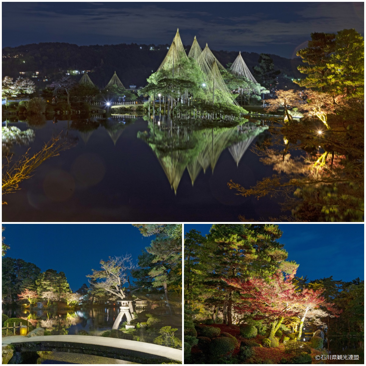兼六園で、毎年人気の秋のライトアップが実施される。 期間中の夜間は兼六園への入園が無料に。園内には約340本のモミジが植えられており、例年晩秋には赤や黄色に色づき、松の緑と美しいコントラストが楽しめる。また、北陸の湿った雪の重みから木の枝を守るため、11月から園内の約800本の樹木に施される雪吊りは、金沢の冬の風物詩としても有名。ライトアップされた兼六園では、雪吊りと秋の紅葉との感動的な美しさが楽しめる。