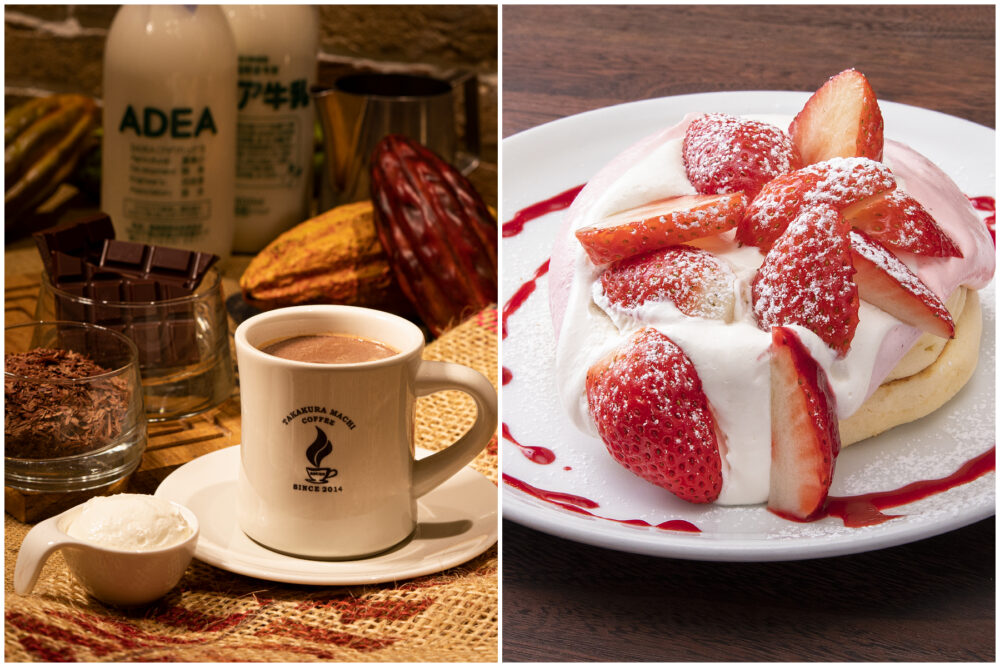 二品目は石川県小松市の『本田農園』で生産された大粒の紅ほっぺを使用した「すみれのほっぺリコッタパンケーキ」。酸味と甘みのバランスが良い旬の紅ほっぺは、同店自慢のまろやかな特製リコッタクリームと相性抜群だ。こちらの提供は5月11日(水)までの予定。温かなホットチョコレートとふんわりパンケーキで、お腹からほっこり温まろう。