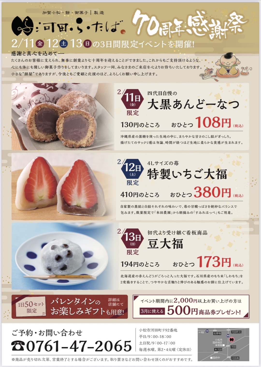 今年70周年を迎えた餅菓子の名店から春の便りが届いた。作りたてを求めて朝から行列ができる人気者『特製いちご大福』が発売を開始したのだ。4Lサイズ以上の厳選した苺を使用しており、白餡と黒餡2種類の餡はそれぞれに苺の甘酸っぱさにあわせた自家製餡を使用。和菓子職人だからこそできる究極の味のバランスが唯一無二の味を作り出している。小松の苺農家『本田農園』の朝摘み苺をはじめ、全国から厳選した4Lサイズ以上の大きな苺と自家製餡を、北陸産の餅粉を使用したモッチリ生地で優しく包み上げている。一口食べると中から“じゅわっ”と果汁が溢れる逸品だ。午前中には売り切れることが多いので、電話で予約して取り置きがおすすめ。2月11日から開催の「70周年感謝祭」も嬉しい企画盛りだくさんで見逃せない。