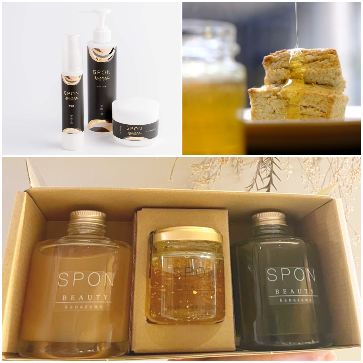 「SPON kanazawa」シリーズには、はちみつや化粧品もある。同ブランドで使用されるすっぽんは、大自然に囲まれた養殖場で大切に育てられたもの。ストレスを抱えないすっぽんは臭みがなく、コラーゲンも豊富だそう。食べても飲んでもおいしく、肌に使用しても安心と評判なのだ。「金のすっぽんはちみつ」のほか、すっぽん、ふかひれ、なまこを贅沢に配合した「すっぽんコスメ(雪国の精)」は、見た目の華やかさもあり、ギフトにも喜ばれている。