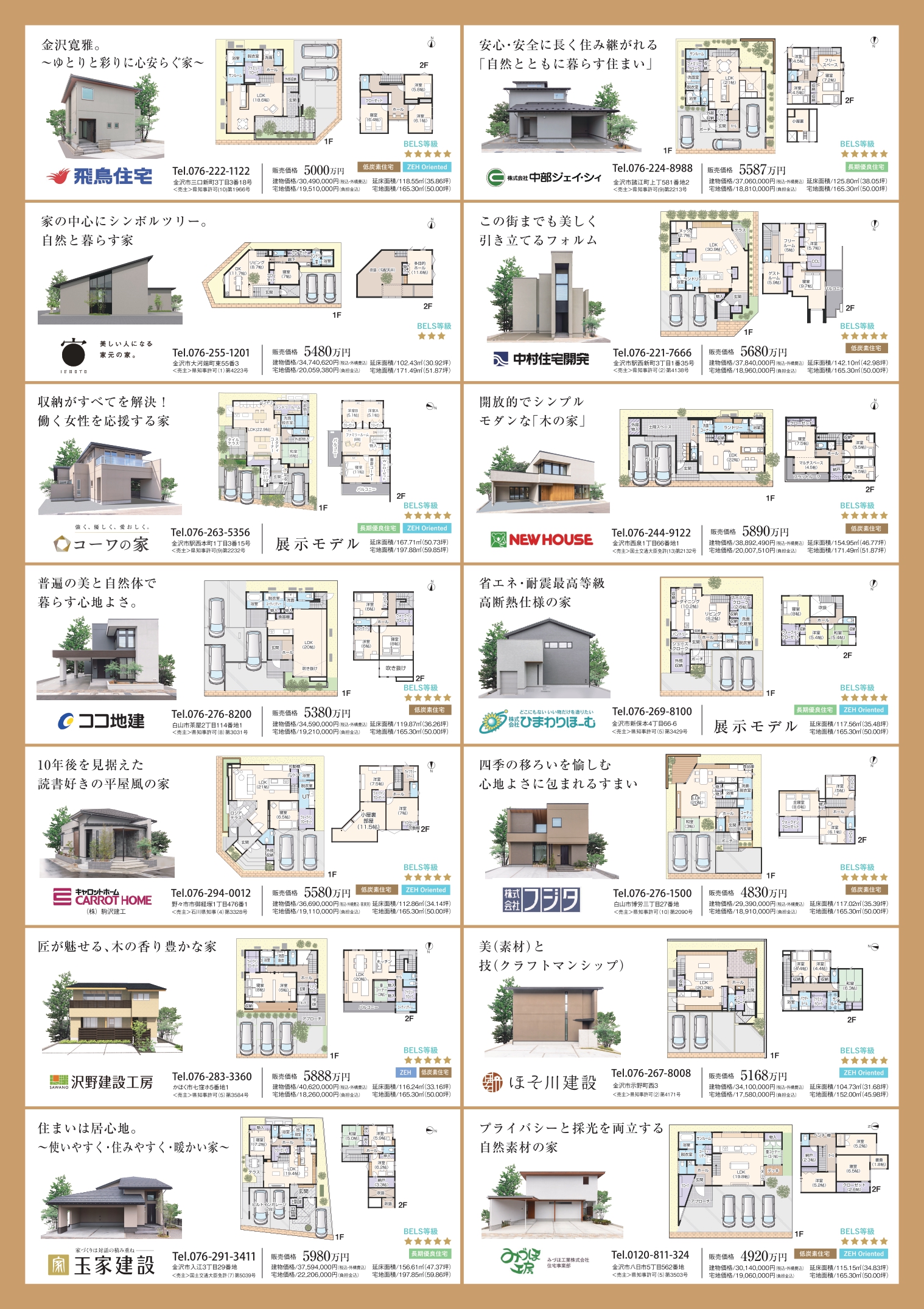 タウンデザインの考えにより、各家の個性を尊重しながらも、連続性のあるファサードや、建物形態・色の調和などのタウンデザインを定め、緑豊かで暮らしやすい上質で品格のある美しいを実現。また、SDGsを踏まえ、環境配慮型の最新の仕様と設備を提案する他、住まいのエネルギー性能を見える化するBELSを全棟取得。自然素材、ECOなどのキーワードを掲げた最新の住宅設備を採用するなど、どの家もこれからの時代に合った家づくりとなっている。加えて、住宅地としての防犯性を高めるための工夫も様々に行われている。生涯に渡って安心と上質な住み心地を約束してくれるこれからの街の形。金沢市からの奨励金最高100万円 も出るので、住まいづくりを検討している人はぜひ足を運んで各社に問い合わせてみよう。