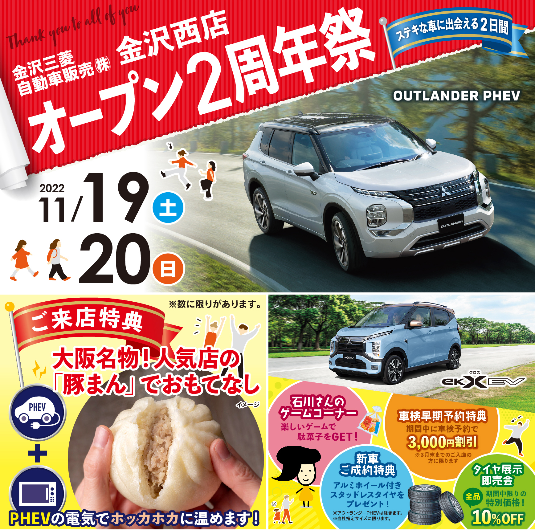なお、来店者にはPHEVの電気を使って温めた大阪有名店の豚まんをプレゼント。PHEVの電気のパワフルさと予備電源がある安心感を実感する機会になるだろう。数に限りがあるため、早めの来店がおすすめだ。その他にも、車検の早期予約、タイヤ即売会、新車の成約特典、石川さんゲームコーナーなどもある。試乗車も多数揃えているので、ぜひEVやPHEVの良さを体感してみて。