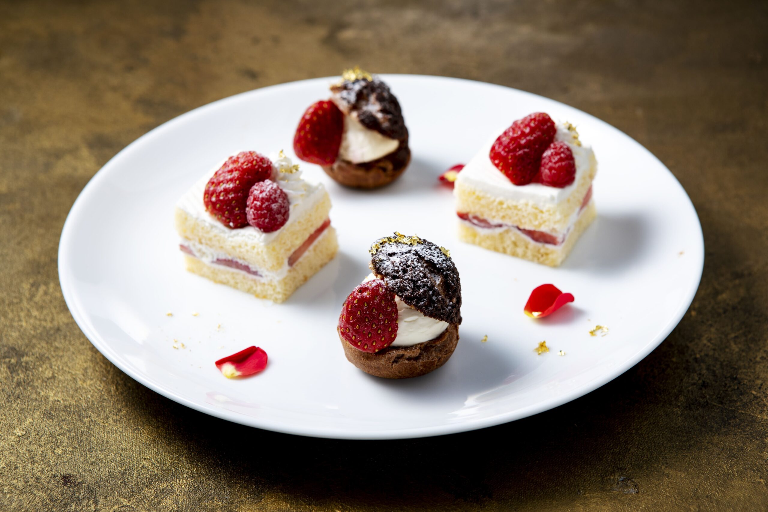 プレートの上段には、国産の苺を余すことなく使ったタルトやフレーズカシス、ロールケーキと苺尽くしの個性豊かなスイーツがずらりと並ぶ。中段には『ホテル金沢』定番人気の苺のショートケーキやコーヒーが香るビターなシューとティラミスのマリアージュが楽しい大人味コーヒーシューティラミスを用意。シェリーグラスのミニパフェには、苺のムースとショコラブランムースを重ね、品質の高いホワイトクーベルチュールと苺のコンビネーションが楽しめる。